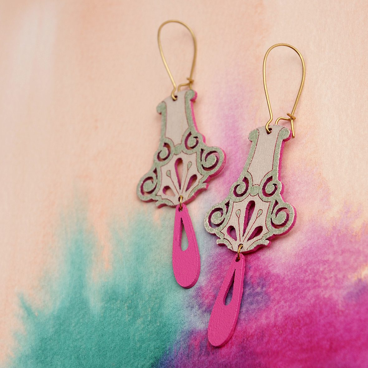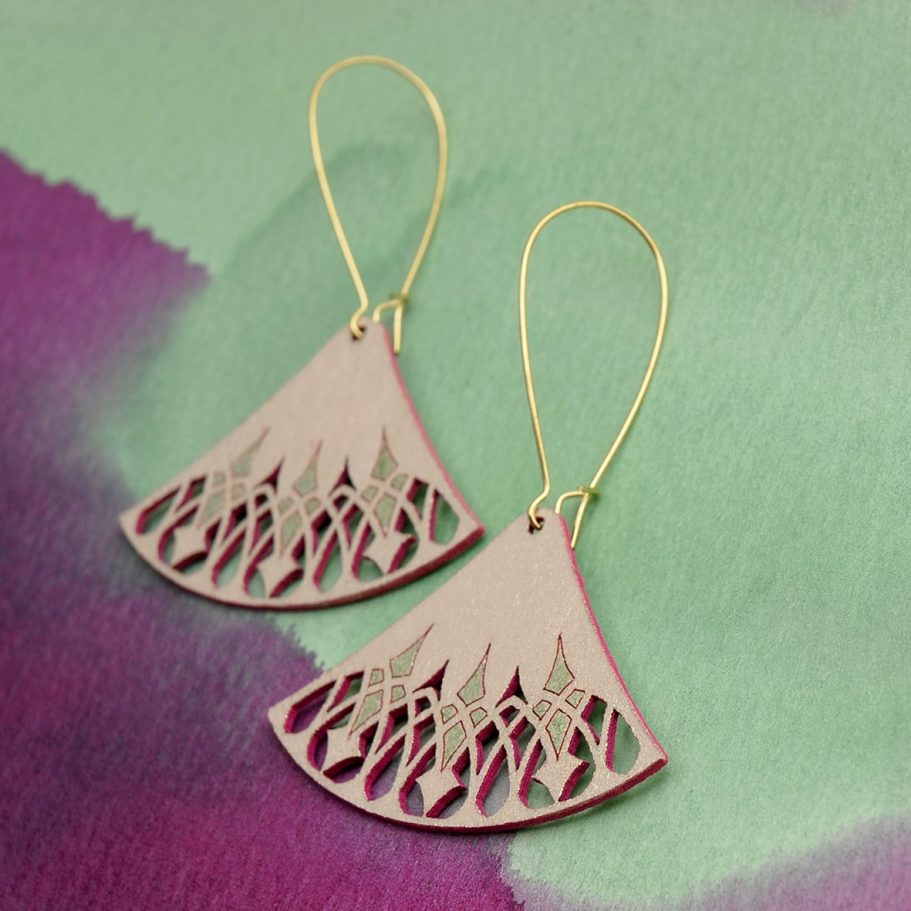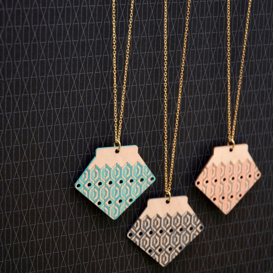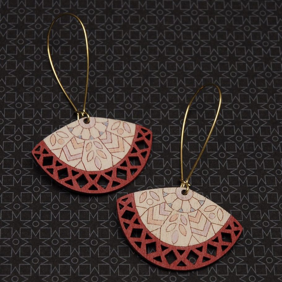 This laser-cut jewellery collection continued my exploration of designed components, while shifting toward a more labour-intensive, hand-crafted finish. Each piece was hand painted with intricate patterns rather than spray painted, drawing inspiration from two of my favourite artists: Charles Rennie Mackintosh and Frida Kahlo. The designs pay homage to Kahlo’s iconic style of dress and use of pattern, alongside Mackintosh’s elegant, architectural forms. Each range comprised six designs and was produced in a shorter run due to the complexity and time-intensive nature of the process.